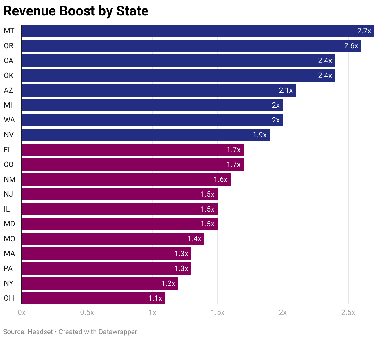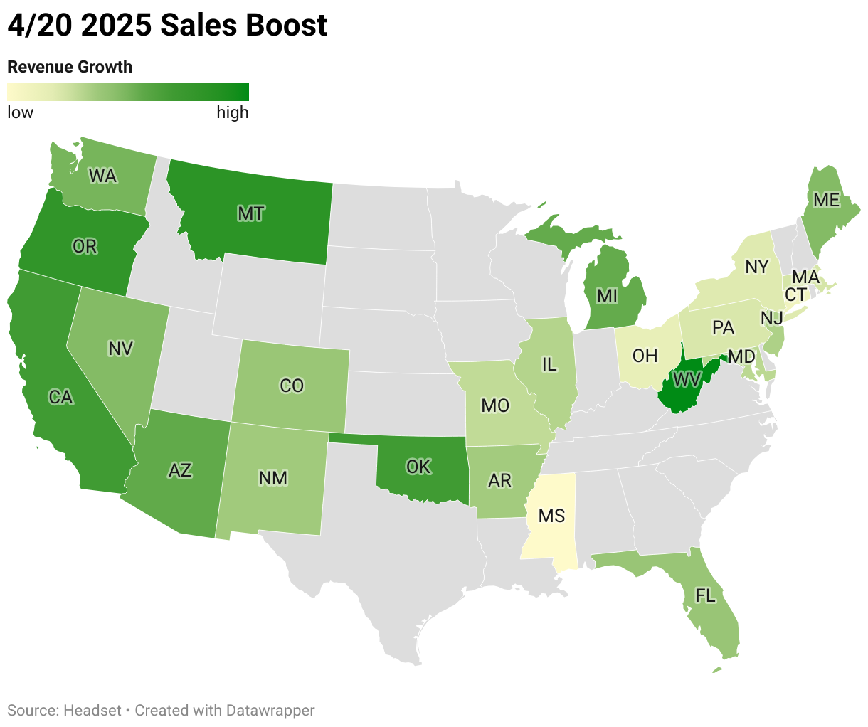 Montana saw the biggest relative 4/20 with 2.7x their typical sales total. Other states like Oregon, California, Oklahoma, and Arizona joined them in the over 2x club this year.