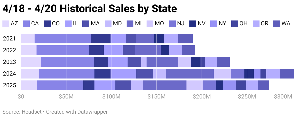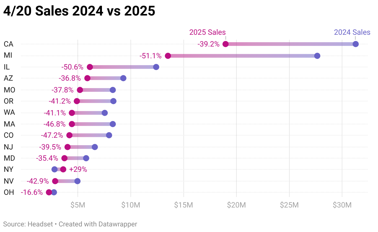 When combining sales totals for April 18th through April 20th, the year-over-year gap narrows to just a 9% decline. In both 2024 and 2025, 4/20 falling on a weekend created a more extended, multi-day shopping experience—unlike previous years when the holiday landed midweek.