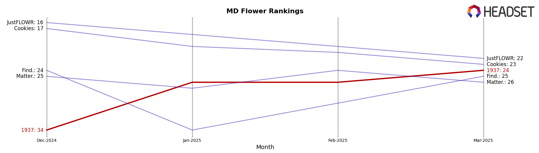 In Maryland, 1937's performance across various categories presents a mixed picture. In the Flower category, the brand saw a decline in rankings, moving from 30th in September 2025 to 43rd by December 2025, with a corresponding drop in sales. This downward trend could indicate increasing competition or a shift in consumer preferences. Conversely, the Vapor Pens category showed a more positive trajectory, improving from 34th in September to 24th by December, suggesting a growing consumer interest in their vapor products. The Pre-Roll category, however, saw fluctuating rankings, with the brand falling out of the top 30 in December, which may be a cause for concern if this trend continues.