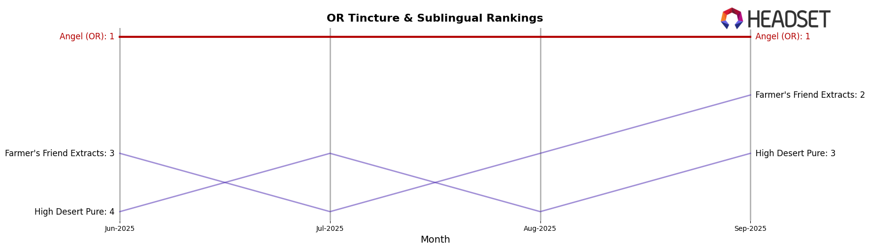 In the competitive landscape of the Tincture & Sublingual category in Oregon, Angel (OR) has maintained a stronghold as the leading brand, consistently ranking first from June to September 2025. This unwavering top position highlights Angel (OR)'s dominance in the market, even as competitors like Farmer's Friend Extracts and High Desert Pure vie for the subsequent ranks. Notably, Farmer's Friend Extracts experienced a notable climb to the second position in September, indicating a potential threat to Angel (OR)'s supremacy if this upward trend continues. Meanwhile, High Desert Pure maintained a stable presence in the third and fourth positions, reflecting steady sales performance. Despite these shifts among competitors, Angel (OR)'s sales saw a significant boost in September, reinforcing its market leadership and suggesting effective strategies in capturing consumer interest and loyalty.