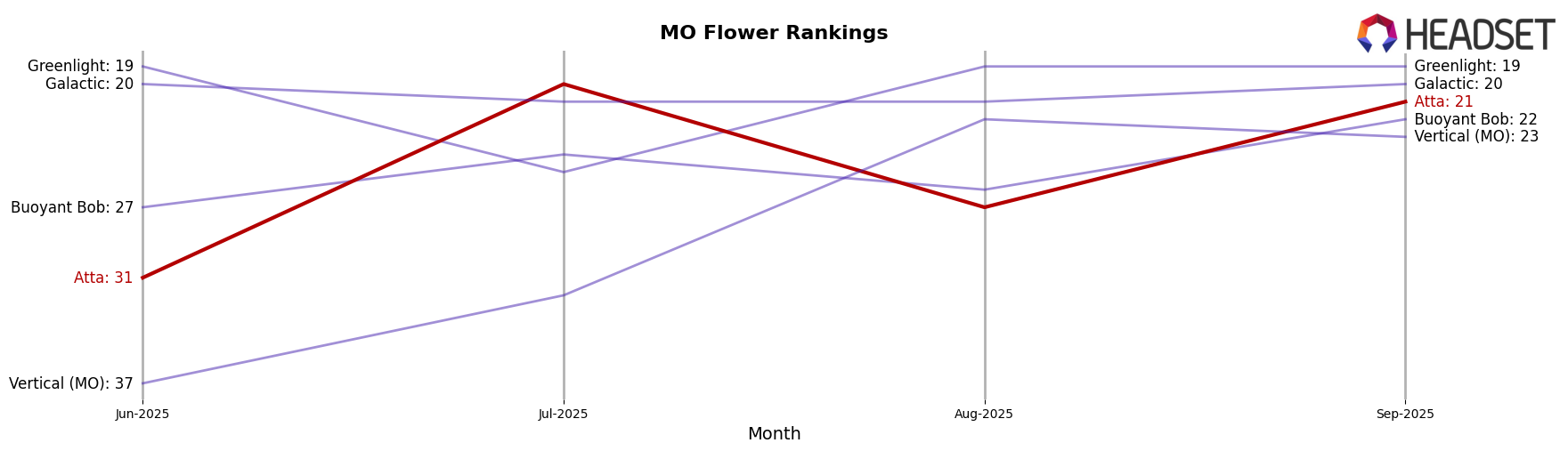 In the competitive landscape of the Flower category in Missouri, Atta has shown notable fluctuations in its rank and sales performance over the past few months. In June 2025, Atta was not among the top 20 brands, but it made a significant leap to rank 20th in July, indicating a strong upward trend. However, it slipped to 27th in August before climbing back to 21st in September. This volatility suggests that while Atta is capable of rapid gains, it faces stiff competition from brands like Greenlight and Galactic, which maintained more stable positions within the top 20 throughout the same period. Notably, Greenlight consistently held the 19th position in June, August, and September, while Galactic remained close, ranking 20th in June and September. Atta's sales trajectory mirrors its rank changes, with a peak in July followed by a dip in August, then a recovery in September, highlighting the brand's resilience and potential for growth amidst a competitive market.
