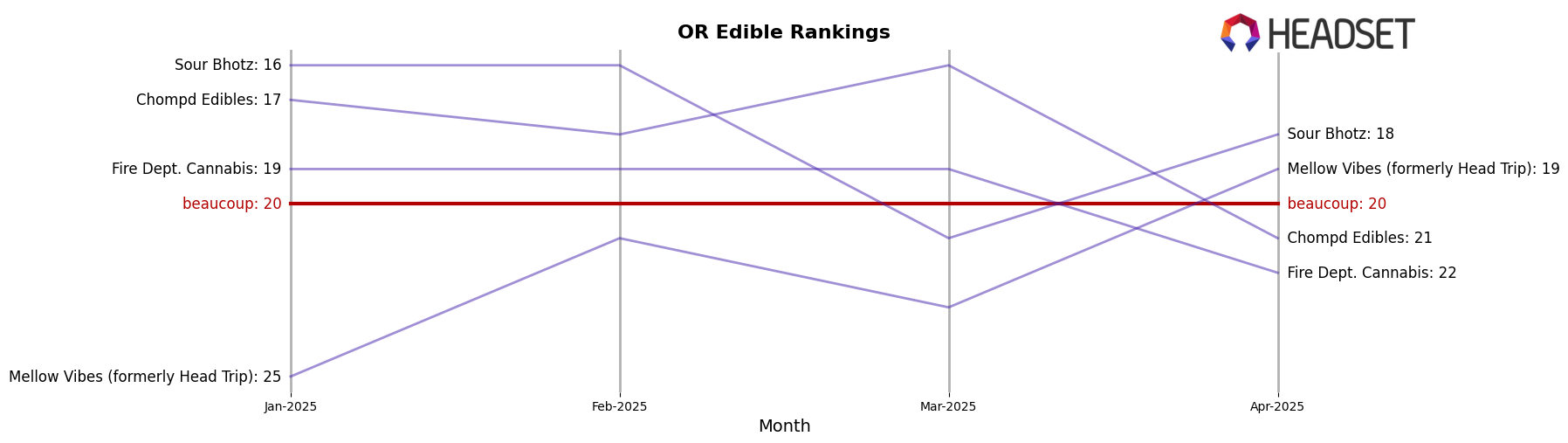 In the competitive landscape of the Oregon edible cannabis market, beaucoup has demonstrated a dynamic shift in its ranking over the last few months. Starting from a rank of 23rd in September 2025, beaucoup climbed to 21st by November, before slightly dropping to 24th in December. This fluctuation in rank is notable as it coincides with a consistent increase in sales from September through November, peaking before a decline in December. This suggests a potential seasonal or market-driven impact on sales. In comparison, Fire Dept. Cannabis maintained a relatively stable position around the 21st and 22nd ranks, indicating a steady presence in the market. Meanwhile, Chompd Edibles showed a significant upward trend, moving from 33rd in September to 23rd by December, reflecting a strong growth trajectory that could pose a competitive challenge to beaucoup. Brands like She Don't Know and Crown B Alchemy remained outside the top 20, suggesting a less competitive threat in the short term. These insights highlight the importance for beaucoup to strategize effectively to maintain and improve its market position amidst dynamic competition.