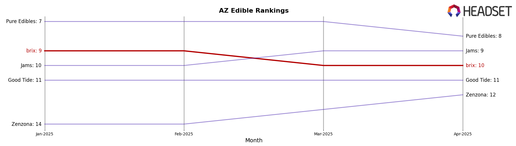 The performance of brix (AZ) in the Arizona market has shown notable consistency within the Edible category. Across the final months of 2025, brix (AZ) maintained a stable presence in the top 10, fluctuating slightly between the 7th and 8th positions. This consistent ranking indicates a strong foothold in the Arizona edible market, which is further supported by a noticeable increase in sales from October to December. While the brand did not break into the top 5, its ability to remain in the top 10 suggests a loyal customer base and effective market strategies.