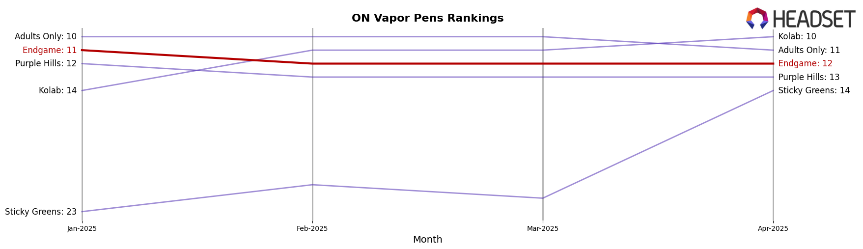 In the competitive landscape of vapor pens in Ontario, Endgame has shown a promising upward trajectory in terms of rank and sales. From September to December 2025, Endgame improved its rank from 14th to 10th, indicating a positive shift in market positioning. This upward movement is particularly notable when compared to competitors such as Versus, which saw a decline from 8th to 12th place over the same period. Meanwhile, Weed Me and DEBUNK maintained relatively stable positions, with Weed Me holding steady at 9th and DEBUNK consistently at 8th. Despite the competitive pressure, Endgame's sales figures have shown a steady increase, particularly in December, where it surpassed Jays (Canada), which fluctuated in rank but ended slightly lower at 11th. This data suggests that Endgame is effectively capturing market share and could be poised for further growth in the Ontario vapor pen market.