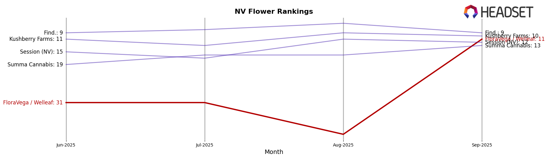 FloraVega / Welleaf has shown a dynamic performance in the flower category within the state of Nevada. In July 2025, the brand secured the 24th position, but experienced a drop in August, falling out of the top 30. However, a significant rebound occurred in September, where they jumped to 11th place, followed by a slight dip to 13th in October. This fluctuation in rankings suggests a volatile yet potentially promising market presence, indicating that while the brand faced challenges, it managed to recover and maintain a strong position towards the end of the period. This recovery could be indicative of successful strategic adjustments or market conditions favoring their product offerings.