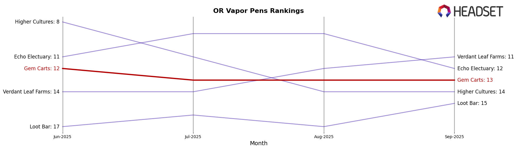 In the competitive landscape of vapor pens in Oregon, Gem Carts has maintained a consistent rank at 13th place from July to October 2025, indicating a stable market position despite fluctuations in sales. During this period, Verdant Leaf Farms has shown upward momentum, improving their rank from 15th in July to 12th by October, which could suggest a growing consumer preference that may challenge Gem Carts' market share. Meanwhile, Echo Electuary has held a steady position at 9th and 11th, maintaining a lead over Gem Carts, although their sales have slightly decreased over the months. Bobsled Extracts and Altered Alchemy have shown rank improvements, with Bobsled Extracts climbing to 14th in October and Altered Alchemy moving up to 15th, reflecting competitive pressures that could influence Gem Carts' strategies. Overall, while Gem Carts remains a strong contender, the dynamic shifts among competitors highlight the need for strategic initiatives to enhance market positioning and sales performance.