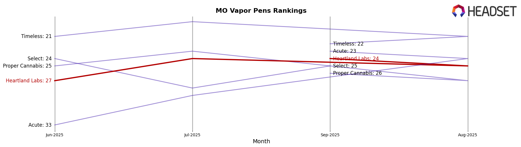 In the competitive landscape of vapor pens in Missouri, Heartland Labs has shown a steady performance in the rankings from July to October 2025, maintaining a position within the top 25 brands. While Heartland Labs was ranked 24th in July, it improved slightly to 23rd by October, indicating a positive trend in its market presence. In contrast, Timeless experienced fluctuations, dropping out of the top 20 in both September and October, which could suggest challenges in sustaining sales momentum. Meanwhile, Safe Bet showed a notable drop from 18th in September to 22nd in October, potentially opening opportunities for Heartland Labs to capture more market share. Proper Cannabis and Flora Farms remained outside the top 20 throughout this period, with Flora Farms showing a significant improvement in October, climbing to 24th. These dynamics highlight Heartland Labs' stable position and potential for growth amidst shifting ranks among competitors.