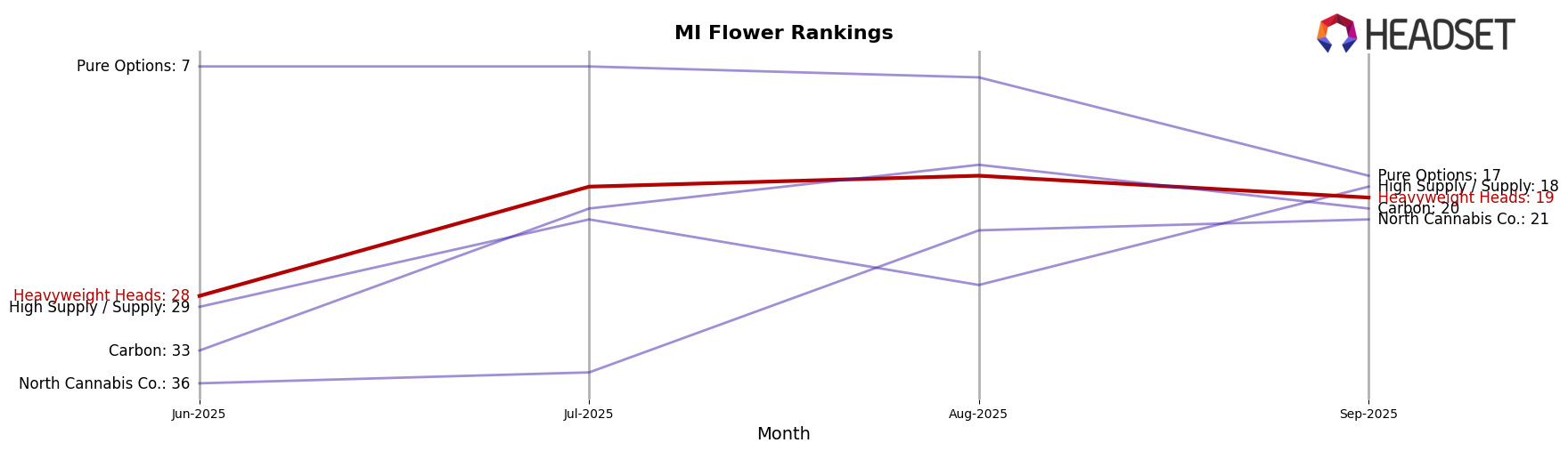 In the competitive landscape of the Michigan flower category, Heavyweight Heads has demonstrated a notable performance trajectory. From June to September 2025, Heavyweight Heads improved its rank from 28th to 19th, showcasing a consistent upward trend in market presence. This improvement is significant when compared to competitors such as High Supply / Supply, which fluctuated between 29th and 18th, and North Cannabis Co., which climbed from 36th to 21st. Meanwhile, Carbon showed a similar pattern to Heavyweight Heads, peaking at 16th in August before settling at 20th in September. Notably, Pure Options experienced a sharp decline from 7th to 17th, indicating potential market challenges. Heavyweight Heads' steady rank improvement, coupled with robust sales growth, positions it as a formidable player in the Michigan flower market, suggesting a positive reception among consumers and a competitive edge over some fluctuating rivals.