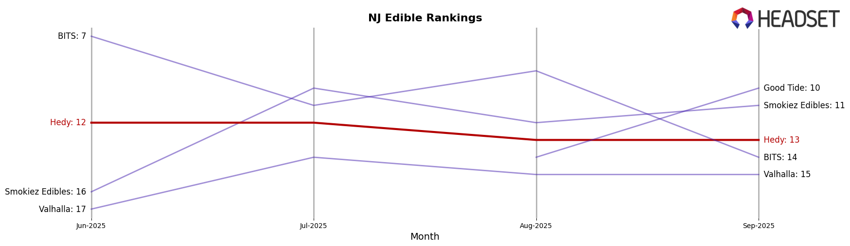 In the competitive landscape of the New Jersey edible market, Hedy has shown a promising upward trend in recent months. Starting in July 2025, Hedy was ranked 12th, and despite a slight dip to 13th in August and September, it climbed back to 11th by October. This improvement in rank is accompanied by a steady increase in sales, peaking at 253,479 in October. In comparison, Smokiez Edibles maintained a relatively stable position, fluctuating between 9th and 12th place, with sales slightly higher than Hedy's. Meanwhile, Good Tide experienced a significant jump from being unranked in July to 9th in September, though it fell back to 13th in October, indicating volatility. BITS also displayed fluctuations, peaking at 9th in August but dropping to 14th in September before recovering to 10th in October. Effin' Edibles consistently outperformed Hedy in terms of rank, although their sales showed a slight decline by October. These dynamics suggest that while Hedy is gaining traction, it faces stiff competition from both stable and volatile brands in the New Jersey edible market.