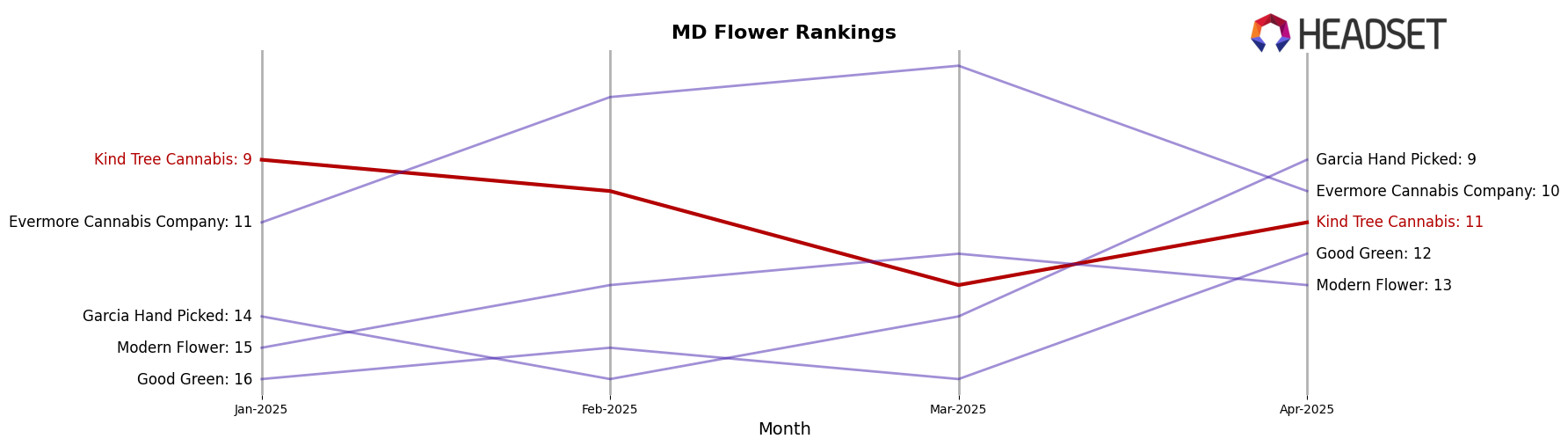 In Maryland, Kind Tree Cannabis has shown consistent performance in the Concentrates and Flower categories. The brand maintained its 8th position in Concentrates from November 2025 to January 2026, reflecting a stable demand in this category. Interestingly, their sales in Concentrates peaked in December 2025. In the Flower category, Kind Tree Cannabis improved its ranking from 12th in November 2025 to 8th by December 2025, maintaining this position into January 2026. This upward movement indicates a robust market presence and suggests that their Flower products are gaining traction. However, the Pre-Roll category tells a different story, where the brand's rank remained relatively stable but in the lower 20s, and sales showed a downward trend by January 2026, which could be an area for improvement. Notably, the brand did not make it to the top 30 in Vapor Pens until December 2025, suggesting potential growth opportunities in this segment.