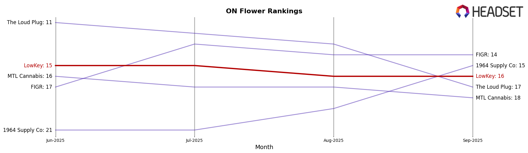 In the competitive landscape of the Flower category in Ontario, LowKey has experienced a notable shift in its market position over the past few months. Starting from a rank of 15 in July 2025, LowKey maintained this position through August but saw a decline to 16 in September and further dropped to 20 by October. This downward trend in rank coincides with a decrease in sales from July to October, suggesting potential challenges in maintaining market share. In contrast, Tenzo has shown a consistent upward trajectory, improving its rank from outside the top 20 to 19 by October, with a steady increase in sales. Meanwhile, MTL Cannabis has maintained a stable rank around 17-18, with sales figures slightly fluctuating but remaining robust. Pure Laine and Sixty Seven Sins have also seen some rank improvements, although their sales are lower compared to LowKey. These dynamics indicate that while LowKey has been a strong player, it faces increasing competition and may need strategic adjustments to reclaim its higher ranking and bolster sales.