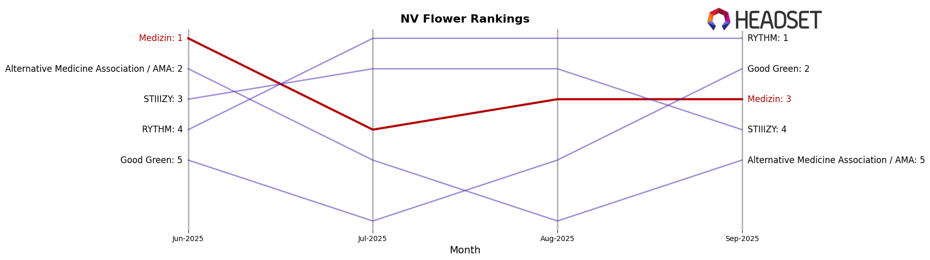 In the competitive landscape of the Nevada Flower category, Medizin has demonstrated notable resilience and adaptability, as evidenced by its fluctuating but ultimately improving rank over the months from July to October 2025. Starting at fourth place in July, Medizin climbed to second place by October, showcasing a strategic recovery in its market positioning. This upward trend is particularly significant given the competitive pressure from brands like STIIIZY, which consistently held a strong position but dropped to third place in October, and RYTHM, which maintained its top rank throughout this period. Meanwhile, Good Green also posed a competitive threat with its dynamic rise from seventh to fourth place by October. Despite a slight dip in sales during August and September, Medizin's October sales rebounded, indicating effective strategic adjustments that allowed it to surpass STIIIZY and secure a higher rank. This analysis underscores the importance of strategic agility in maintaining and improving market position amidst fierce competition.