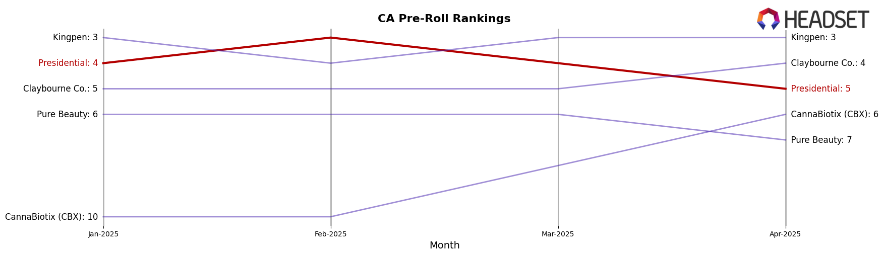 In the competitive landscape of the Pre-Roll category in California, Presidential has maintained a stable position, consistently ranking 4th in September, November, and December 2025, with a slight dip to 5th in October. This stability in rank reflects a positive trend in sales, with a noticeable increase from September to December. Despite this, Presidential faces stiff competition from brands like Kingpen, which consistently holds the 3rd rank, and STIIIZY, which dominates the 2nd position with significantly higher sales figures. Meanwhile, Sluggers Hit shows dynamic movement, jumping from 7th in September to 4th in October, indicating a potential threat to Presidential's position. CannaBiotix (CBX) remains a consistent competitor at the 6th rank, closely trailing Presidential. This competitive environment suggests that while Presidential is performing well, there is a need for strategic initiatives to further boost its market position and sales growth.