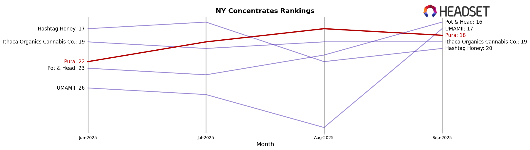 Pura's performance across different categories in New York exhibits notable fluctuations. In the Concentrates category, Pura started strong in July 2025 with a rank of 20th, improving to 16th in August. However, the subsequent months saw a decline, with rankings slipping to 19th in September and further down to 27th by October. This downward trend is reflected in their sales figures, which peaked in August and then saw a significant drop by October. On the other hand, in the Flower category, Pura's presence was not as prominent, with rankings only available for July and August, where it was outside the top 30, indicating a limited impact in this segment.