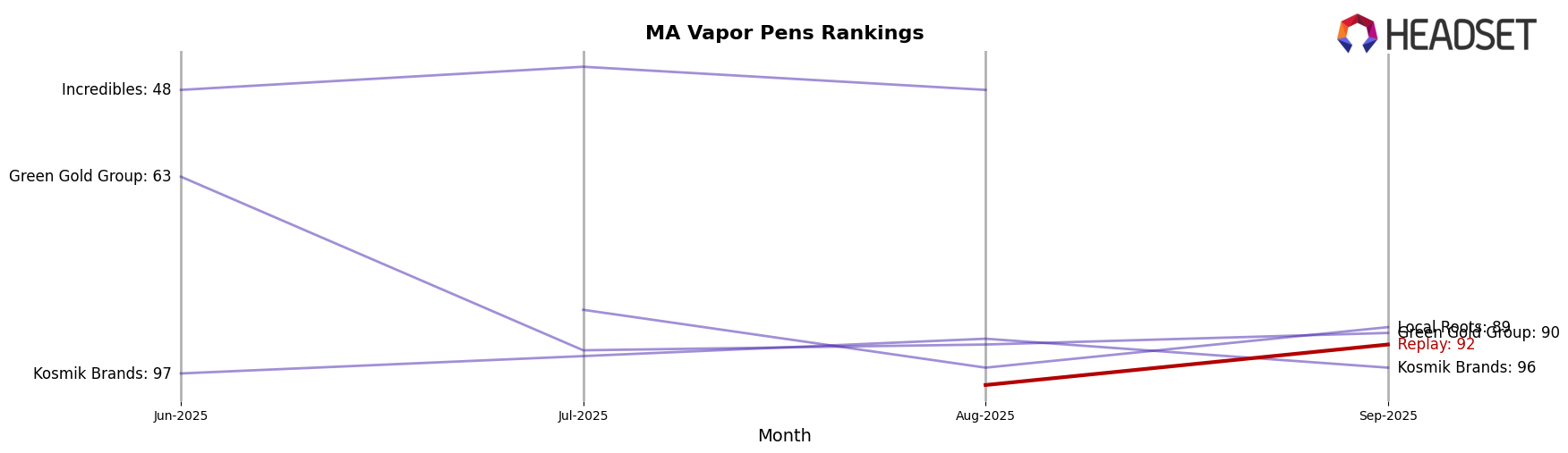The trends observed in Massachusetts could serve as a critical insight for Replay as it evaluates its performance across other states and categories. The lack of top-tier ranking in Massachusetts might reflect broader challenges or opportunities in Replay's market approach, especially in the Vapor Pens category. It would be beneficial for stakeholders to explore whether similar patterns exist in other regions or if Massachusetts is an outlier. Understanding these dynamics could provide a pathway for Replay to refine its strategies and potentially improve its standing in future rankings.