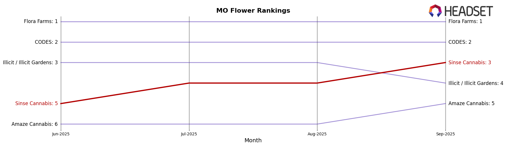 In the competitive landscape of the Missouri flower category, Sinse Cannabis has demonstrated a strong and consistent performance, maintaining its rank at 3rd place from September to October 2025. This stability in ranking is a positive indicator, especially when considering the fluctuations experienced by other brands. For instance, Illicit / Illicit Gardens dropped from 3rd to 4th place in September, while Amaze Cannabis improved its position from 6th to 5th in October. Despite these shifts, Sinse Cannabis has managed to increase its sales significantly, reaching its highest in October 2025, which suggests a growing consumer preference and effective market strategies. This upward trend in sales, coupled with a stable rank, positions Sinse Cannabis favorably against top competitors like Flora Farms, which consistently holds the top rank, and CODES, which remains in 2nd place. The data indicates that Sinse Cannabis is not only holding its ground but also gaining momentum in the Missouri flower market.