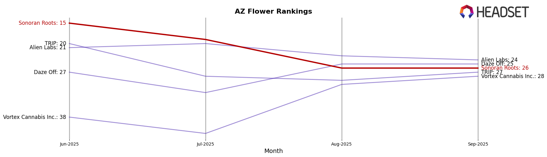 Sonoran Roots has shown a steady presence in the Arizona market, particularly in the Pre-Roll category, where it maintained a rank within the top 20 throughout the months from July to October 2025. Their ranking in this category slightly fluctuated but remained strong, moving from 14th in July to 15th in October. This consistency indicates a stable demand for their Pre-Roll products, even though sales saw a dip in August and September before recovering in October. In contrast, their performance in the Flower category has seen a gradual decline in rankings, slipping from 20th in July to 27th by October, suggesting a possible shift in consumer preferences or increasing competition in that category.