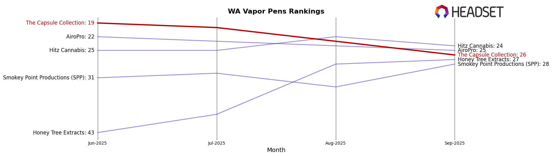 In the competitive landscape of vapor pens in Washington, The Capsule Collection has experienced a notable decline in its market position from July to October 2025. Initially ranked 22nd in July, it fell to 30th by October, indicating a downward trend in its competitive standing. This decline in rank correlates with a decrease in sales over the same period, suggesting potential challenges in maintaining consumer interest or market share. In contrast, competitors like Falcanna and Herb's Oil have shown upward momentum, with Falcanna improving its rank from 47th to 33rd and Herb's Oil climbing from 42nd to 29th. These competitors have not only increased their sales but also improved their market positions, which could be drawing customers away from The Capsule Collection. The data suggests that The Capsule Collection may need to reassess its strategies to regain its competitive edge in this dynamic market.