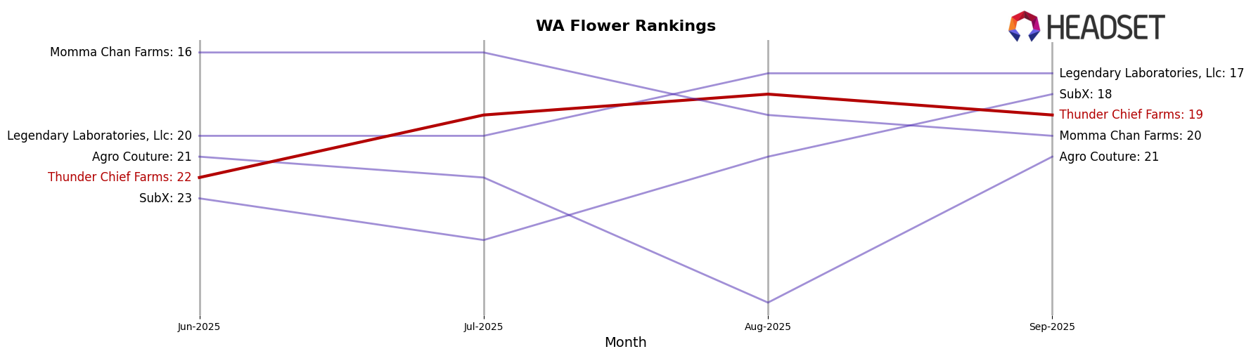 In the competitive landscape of the Flower category in Washington, Thunder Chief Farms has experienced fluctuations in its market position over the past few months. Notably, Thunder Chief Farms held a strong position in July 2025, ranking 20th, but saw a decline to 24th by October 2025. This shift in rank is reflective of a decrease in sales from August to October 2025. Meanwhile, competitors such as SubX and High Tide Cannabis Company (WA) have shown resilience, with SubX improving its rank from 24th in July to 22nd in October, and High Tide Cannabis Company (WA) climbing from 31st to 23rd in the same period. These movements suggest that while Thunder Chief Farms remains a significant player, it faces increasing competition from brands that are gaining traction in the market. Understanding these dynamics can provide valuable insights for strategic adjustments to regain and enhance market share.