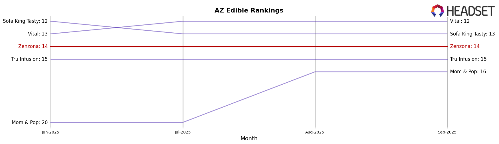 In the Arizona edible market, Zenzona experienced a slight decline in its competitive standing from July to October 2025, dropping from 14th to 16th place. This shift is notable as it coincides with a decrease in sales, which fell from their peak in July. In contrast, Tru Infusion maintained a consistent rank, improving slightly from 15th to 14th, while also showing a significant increase in sales by October. Similarly, Mom & Pop climbed from 20th to 15th place, with a substantial boost in sales, indicating a rising trend. Meanwhile, Grow Sciences and Amy & Al's fluctuated in their rankings but did not show the same upward sales trajectory as Tru Infusion and Mom & Pop. These dynamics suggest that while Zenzona remains a key player, it faces increasing competition from brands that are gaining market traction and improving their sales performance in the Arizona edible category.