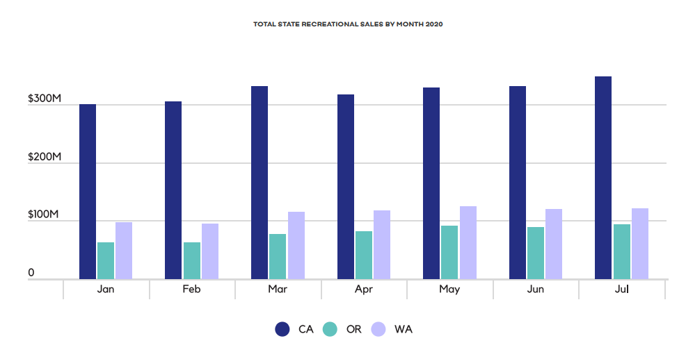 To give more historical context to Oregon’s most recent quarter of sales, in this slide we see west coast states’ recreational sales by month for 2020. From January 2020to July 2020, Oregon sales grew 49.8% from $62M to $94M, outpacing California growth (+16.1%) by 3x and Washington growth (+25.4%) by almost 2x.